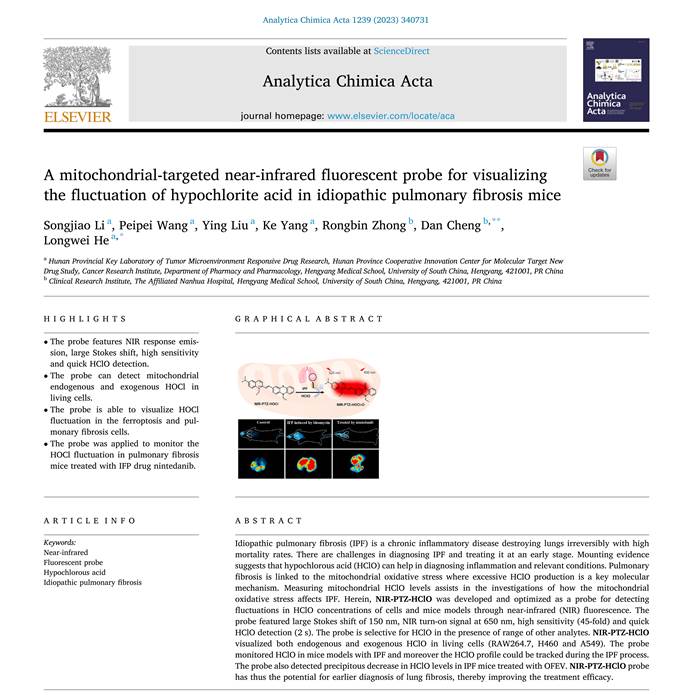 成果四:A mitochondrial-targeted near-infrared fluorescent probe for visualizing the fluctuation of hypochlorite acid in idiopathic pulmonary fibrosis mice