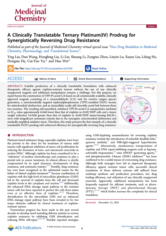 3月10日,9428cn太阳集团古天乐魏华/喻翠云教授团队在药物化学领域国际一流期刊Journal of Medicinal Chemistry(中科院1区,IF:8.039)在线发表了题为“A Clinically Translatable Ternary Platinum (IV) Prodrug for Synergistic Reversing Drug Resistance(2023,DOI: 10.1021/acs.jmedchem.2c01924.)”的研究论文。
