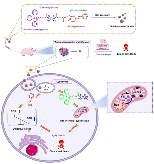 示意图:线粒体靶向TPP-PT-acetal-CA NPs用于癌症治疗。pH和GSH介导了TPP-PT-acetal-CA NPs在肿瘤细胞内的去稳定化,酸性pH触发了CA的释放,诱导肿瘤细胞内强氧化应激,GSH诱导顺铂释放导致线粒体功能紊乱,二者协同导致细胞凋亡。