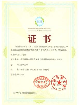 10月17日-19日,由高等公司国家级实验教学示范中心联席会和中国药科大学主办,天津大学药物科学与技术公司承办的“第二届医药院校药学/中药学世界老员工创新创业暨实验教学改革大赛”在天津举办。经过初选函评和现场答辩等多环节激烈角逐,由公司选送的9428cn太阳集团古天乐刘阳老师指导的“生物医用水凝胶创新团队”的成员李蓉、王毅、尹玉利、王云娟、黎倩瑶等参与的项目最终荣获员工创新创业二等奖。