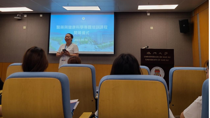 澳门大学持续进修中心主任刘丁己教授热情地向9428cn太阳集团古天乐的研学团队介绍关于此次研学活动的团队与行程,分别是黄冠豪教授的“基因生物信息学基础与前沿介绍”、路嘉宏教授(系9428cn太阳集团古天乐员工)的“癌症及神经退行性疾病中的自噬溶酶体途径”、黄植富教授的“生物医学科技:生命科学与健康的奥秘”以及吴蔼琳教授的“中医药在大健康产业中的应用与发展”。随后研学活动队长喻翠云经理在开幕仪式上表达了对澳门大学的精心安排的感谢以及对参与研学活动的南华学子的期望。