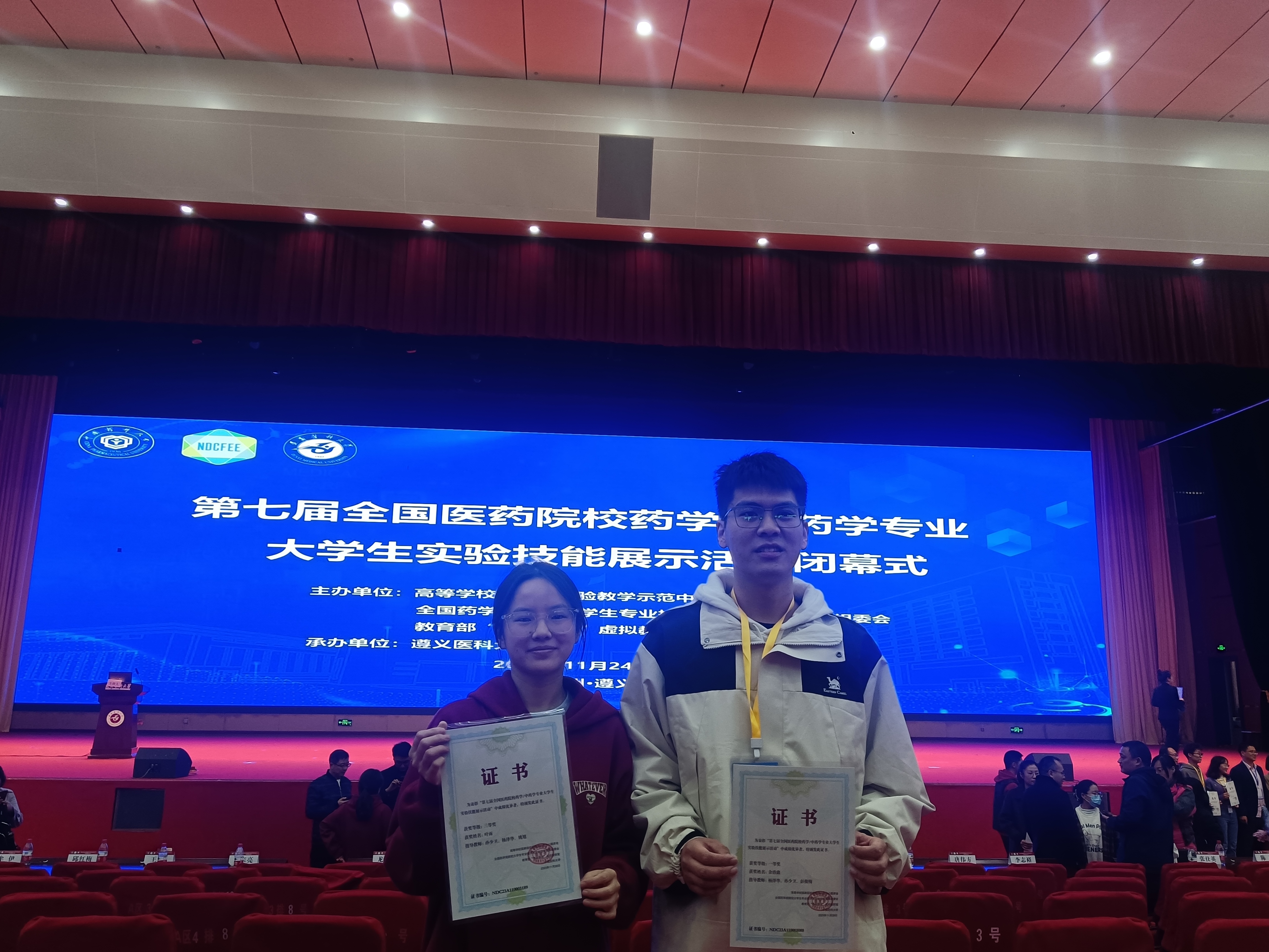 2023年11月26日,“第七届全国医药院校药学/中药学专业老员工实验技能展示活动”决赛在遵义医科大学落下帷幕。经过长达六小时的笔试和实验操作两轮展示环节比拼,20级药学专业的余治鑫、21级药学专业的叶雨两位同学发挥出色,分别获得一等奖和三等奖。这也是9428cn太阳集团古天乐在此类比赛中国家一等奖的历史性突破。