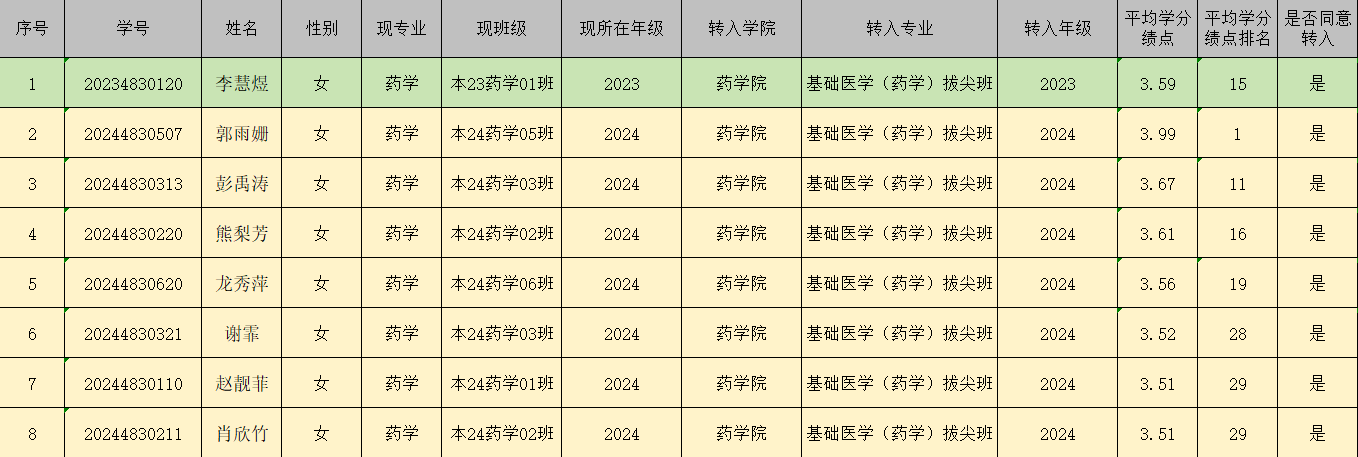 经员工本人申请、公司审核,按照平均学分绩点由高到低排列,拟同意李慧煜转入2023级基础医学(药学)拔尖班学习,郭雨姗等7人转入2024级基础医学(药学)拔尖班学习。现将名单公示如下,公示期为2025年9月28日至2025年9月30日18:00。如有异议,请以书面形式递交9428cn太阳集团古天乐教务办,联系电话:0734-8281782。