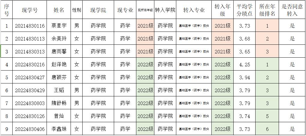 经员工本人申请、公司审核,按照在校期间平均学分绩点由高到低排列,公司拟同意蔡星宇等3人转入2021级基础医学(药学)拔尖班学习,赵泽艳等6人转入2022级基础医学(药学)拔尖班学习。现将名单公示如下,公示期为2023年10月13日至2023年10月15日18:00。如有异议,请以书面形式递交9428cn太阳集团古天乐教务办,联系电话:0734-8281782。