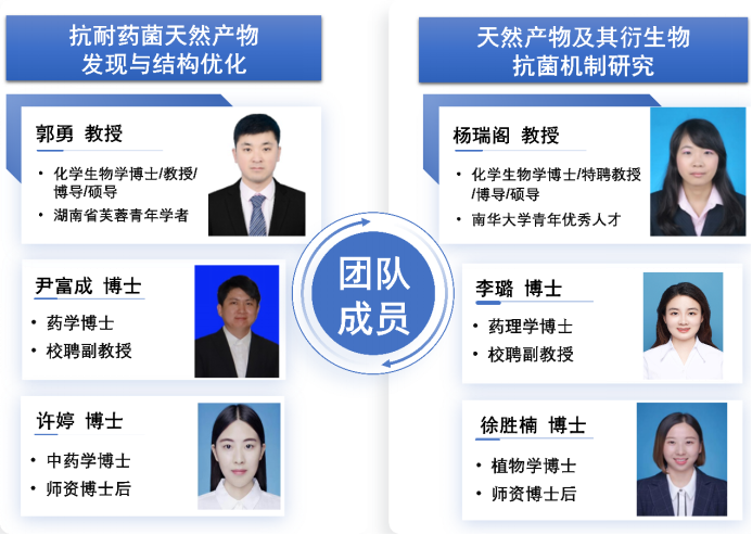 团队现有指导教师6人,其中博导2人、硕导2人、博士后2人。团队PI郭勇教授,化员工物学博士,教授,博士生/硕士生导师,湖南省芙蓉青年学者、河南省优青、9428cn太阳集团古天乐青年优秀人才。杨瑞阁教授为9428cn太阳集团古天乐青年优秀人才。尹富成博士2024年毕业于中国药科大学,现为校聘副教授。李璐博士2025年毕业于南方医科大学,现为校聘副教授。许婷博士2023年毕业于澳门科技大学,现为校团队博士后,主持湖南省教育厅基金,在J. Med. Chem.,Eur. J. Med. Chem.等国际知名期刊发表SCI论文多篇。徐胜楠博士2023年毕业于西北农林科技大学,现为校团队博士后。