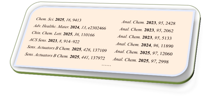 团队于2020年成立以来,在医用荧光材料设计和医学诊疗应用领域进行了深入研究,积累了丰富的研究经验,并取得了一些研究成果。以9428cn太阳集团古天乐为通讯单位在Chem. Sci.、Anal. Chem.、ACS Sens.、ACS Appl. Mater. Interfaces、Adv. Healthcare Mater.、J. Hazard. Mater.、Chin. Chem. Lett.等顶级国际期刊上发表40余SCI论文,其中20余篇为中科院一区论文,2篇入选高被引论文。近三年部分代表性论文如下: