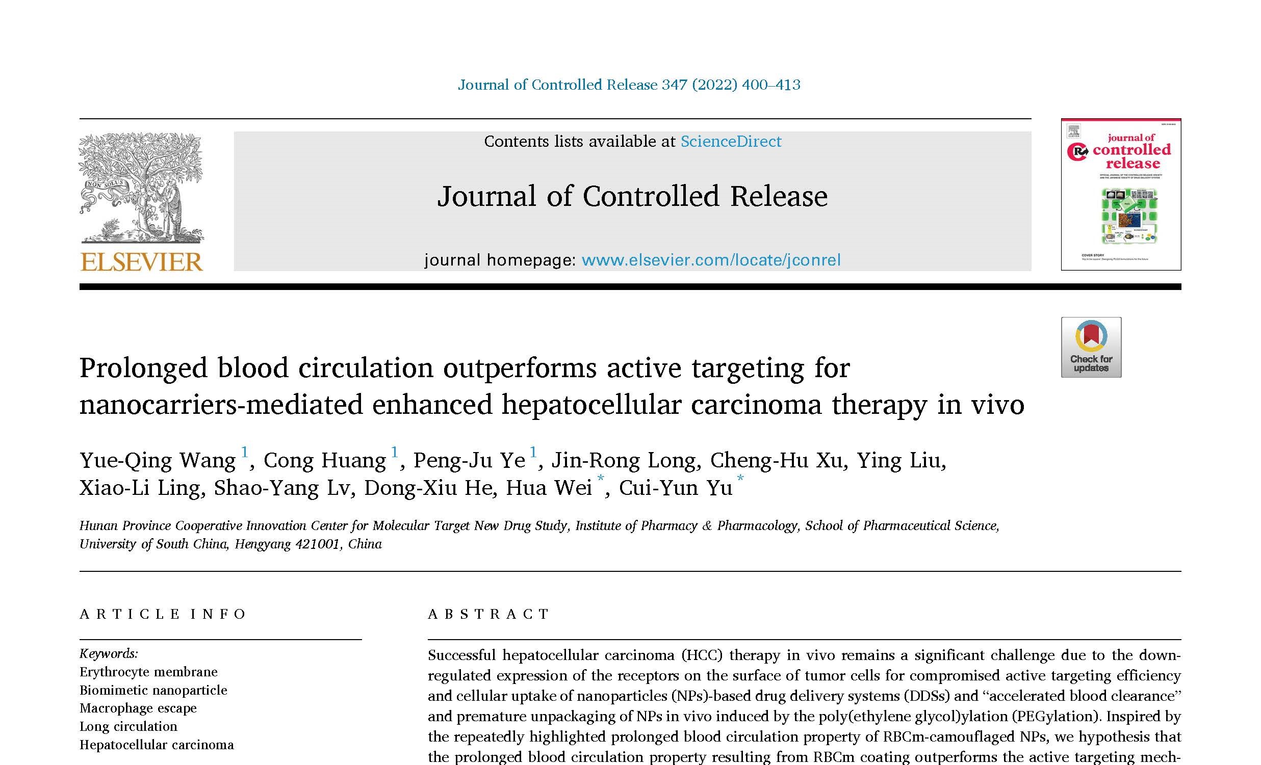 近日,9428cn太阳集团古天乐魏华教授和喻翠云教授联合科研团队在药剂学国际一流期刊Journal of Controlled Release(简称JCR,医学1区,TOP期刊,IF:9.776)上发表了题为“Prolonged Circulation Outperforms Active Targeting for Enhanced Hepatocellular Carcinoma Therapy(2022, 347, 400-413.)”的研究论文。该研究通过红细胞膜包裹天然多糖基聚合物前药纳米粒子构筑了仿生纳米载体,在小鼠体内实现了针对肝癌的高效治疗。研究首次揭示了红细胞膜赋予仿生纳米载体的血液长循环性能比纳米载体自身的肝癌细胞主动靶向性能在针对肝癌的体内治疗中发挥着更为重要的作用。仿生纳米载体在大鼠体内的血液循环半衰期(t1/2)是聚合物前药纳米粒子的3倍,是小分子化疗药物阿霉素的3.5倍,因而仿生纳米载体在荷瘤小鼠体内展现了最好的抑瘤效果。该研究为肝癌的临床高效治疗提供了理论指导。9428cn太阳集团古天乐硕士研究生汪月琴、黄聪和叶鹏举为共同第一作者,9428cn太阳集团古天乐喻翠云教授和魏华教授为共同通讯作者。这是该研究团队在近一年的时间内,连续在JCR上发表的第五篇科研成果。