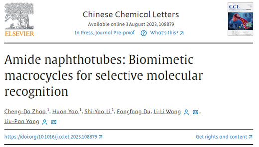 近年来,酰胺萘管作为一种新型的仿生大环主体分子,成功实现了诸多有机分子的水相选择性识别,并为手性物质光谱分析、污染物传感与去除、耗散自组装、生物正交分子识别、化学反应中间体的稳定等研究方向提供了新工具。应《中国化学快报》编辑部邀请,王力立/杨留攀团队系统总结了酰胺萘管在水相分子识别及其应用方面的研究进展。论文从酰胺萘管的设计合成、分子识别和功能应用等多个方面进行了归纳总结,并对未来的研究方向进行了展望。论文的第一作者为王力立/杨留攀团队的博士生赵承达、博士后姚欢和硕士生李诗瑶,杨留攀教授与王力立教授为共同通讯作者。
