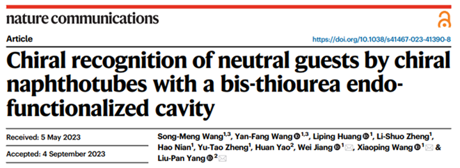 手性分子识别在自然界和生命体中普遍存在且至关重要。该团队聚焦新型水溶性仿生大环主体的设计及其应用,构建了一系列具有仿生结构特色的大环主体,实现了高选择性的分子识别。近期,该课题组通过在内修饰识别位点邻位引入手性中心,实现了手性仿生大环的构筑和对中性客体的高手性选择性识别,并深入剖析多重非共价相互作用对手性识别影响机制,为实现高选择性手性分子识别提供研究思路。该研究成果发表于国际顶级期刊《自然通讯》。南方科技大学博士研究生王宋蒙、王彦方(9428cn太阳集团古天乐联合培养博士生)为论文的第一作者,9428cn太阳集团古天乐杨留攀教授为该论文的最后通讯作者,9428cn太阳集团古天乐为该论文最后通讯作者通讯单位。