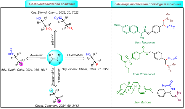 由于其丰富性、易得性和多样的反应性,烯烃已成为有机合成中备受青睐的骨架结构。其中,烯烃的1,2-双官能团化是一项特别引人注目的转化。在这种转化中,可以通过一步反应同时在碳碳双键的相邻位置安装两个官能团,因此可以直接利用简单的原料来迅速增加分子的复杂性。目前,9428cn太阳集团古天乐王震教授科研团队在烯烃的1,2-双官能化反应方向取得了系列研究进展,包括烯烃的硝化/羟基化反应、硝化/硝酸酯化反应、氟羟基化反应、氨酯化反应、不对称双胺化反应等。新方法的开发,解决了原有方法需要使用预功能化底物、区域选择性差、底物范围窄和反应时间长等缺点。利用这些方法,不仅可以快速构建药物分子和天然产物中重要的结构单元,也可以为现有药物的结构修饰提供新的策略。以上工作得到了国家自然科学基金、湖南省自然科学基金、9428cn太阳集团古天乐科研启动经费等项目的支持。