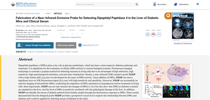 近日,9428cn太阳集团古天乐荧光探针与生物医学成像实验室何隆薇教授团队在糖尿病光学诊断试剂设计及应用取得新进展,相关研究成果以“Fabrication of aNear-infrared-emissiveProbe forDetectingDipeptidylPeptidase 4 in theLiver ofDiabeticMice andClinicalSerum”为题在权威期刊《Analytical Chemistry》(中科院1区TOP期刊,影响因子6.7)发表研究性论文。