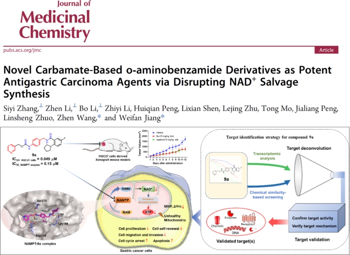 基于此基础,本研究以F8骨架结构为先导,通过对其进一步修饰改造及抗胃癌细胞活性筛选得到了化合物9a。相比前体化合物F8,9a具有更强的抗未分化胃癌细胞活性(HGC-27 cells, IC50= 0.049 μM)。其抗胃癌作用涉及克隆形成、细胞增殖、转移、细胞周期和代谢等多个细胞过程。转录组分析与基于配体的靶点预测方法表明,9a是一种潜在的NAMPT抑制剂(IC₅₀ = 0.15 μM),能够通过降低细胞内NAD⁺和ATP水平,从而发挥抗胃癌作用。该研究表明9a是一种具有显著抗未分化型胃癌作用的潜在NAMPT抑制剂,为通过靶向NAD⁺生物合成开发新型抗胃癌药物奠定了基础。研究结果发表于药物化学经典权威期刊《Journalof Medicinal Chemistry》(中科院1区Top,DOl: 10.1021/acs.jmedchem.4c02686)。本论文通讯作者为9428cn太阳集团古天乐王震教授和江伟凡博士,第一作者为9428cn太阳集团古天乐硕士研究生张思怡、李真及李博。