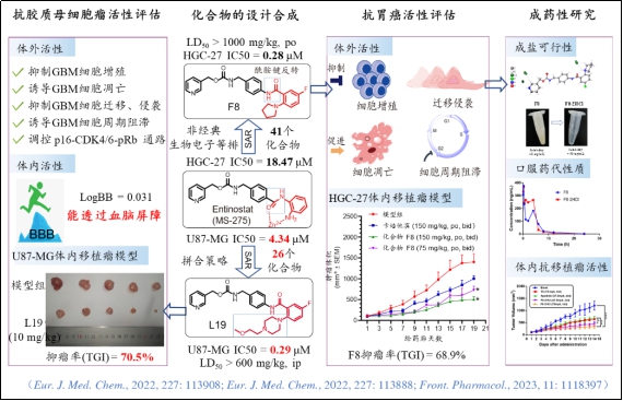 江伟凡博士所在王震教授团队,前期以HDAC ClassI类选择性抑制剂恩替诺特和西达本胺为先导,基于非经典生物电子等排原理反转酰胺键,开发得到了具有较好血脑屏障透过率及抗胶质瘤活性的哌嗪取代苯甲酰胺类衍生物L19(Eur. J. Med. Chem., 2022, 227: 113908),以及具有抗未分化胃癌细胞活性的邻氨基苯甲酰胺类衍生物F8(Eur. J. Med. Chem., 2022, 227: 113888),其在实验动物体内的抗人未分化胃癌细胞HGC-27移植瘤活性,显著优于一线化疗药物卡培他滨和三线小分子靶向药物阿帕替尼。同时针对F8溶解性差、体内吸收差和给药剂量较大等问题,团队前期通过F8成盐提高其成药性,改善其体内药代动力学性质和抗移植瘤活性(Front. Pharmacol., 2023, 11: 1118397)。虽然研究显示,F8及其盐酸盐可作为一种有前景抗未分化胃癌药物,但其抗胃癌作用靶点及机制仍不清楚。