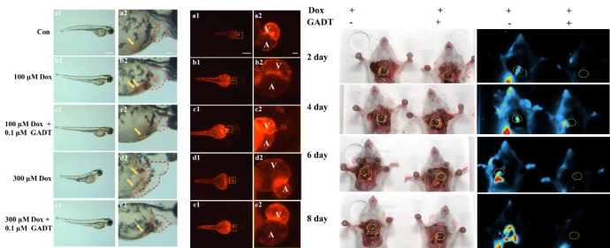 为了证实高尔基体靶向硫化氢供体GADT的治疗效果是显著且广泛的,分别在斑马鱼和小鼠这两种经典的活体动物模型中进行了验证实验。在Dox致斑马心损模型中,GADT有效缓解了斑马鱼的心包水肿和血管栓塞以及房室损伤。在Dox给药的小鼠中,由探针GHO作为荧光诊断试剂,可以看到Dox在不同给药量下均导致了小鼠心脏荧光的上升,预示着Dox导致了小鼠心脏上活性氧的爆发,而GADT在不同给药量都体现了对活性氧的清除效果,表现为GHO的荧光减弱。因此,GADT能有效修复阿霉素诱导的心肌细胞损伤中的高尔基体损伤,在细胞、斑马鱼和小鼠等多个模型中均表现出显著的心脏保护作用。