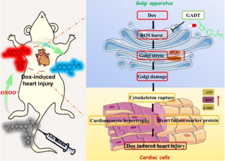 阿霉素(Dox)作为一种广谱蒽环类抗生素,一直是化疗方案的基石药物。然而,超过半数使用Dox的患者在一年内会出现心脏损伤,这种副作用极大地限制了其临床应用,且机制尚未明确。Dox在体内经烟酰胺腺嘌呤二核苷酸脱氢酶(NADH)、内皮型一氧化氮合酶(eNOS)还原酶等多种酶作用后,会产生超氧阴离子(O2.-),这些活性分子进一步与周围的一氧化氮结合,生成毒性更强的过氧亚硝酸盐阴离子(ONOO-),通过激活基质金属蛋白酶等途径,最终导致心肌细胞损伤。因此,监测O2.-和ONOO-浓度的波动或成为研究阿霉素心脏毒性的关键。高尔基体是真核细胞中的一种重要细胞器,当高尔基体受到诸如活性氧爆发等外部应激时,其形态发生改变,导致其内部成分的重新分配和蛋白质分泌和修饰的改变,此过程被称为高尔基应激。现今已有大量文献报道高尔基应激参与了各种重大疾病的发生发展,但是这一过程的具体分子机制仍未被揭示。为此,9428cn太阳集团古天乐药学何隆薇教授团队和陈临溪教授团队进行深入合作研究,首次将高尔基体作为研究阿霉素心脏毒性的核心靶点,并成功开发了相应的诊断和治疗工具。