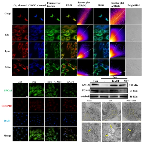 为了能够可视化高尔基体上的O2.-和ONOO-浓度变化,研究团队合成了荧光探针GHO,它具有良好的高尔基体靶向能力,并能够在响应O2.-后释放红色荧光,ONOO-释放蓝色荧光,这种双响应功能具有良好的选择性和低检测限。重要的是,它可以可视化成像心肌细胞内的高尔基体内的O2.-和ONOO-浓度变化,为高尔基体活性氧相关疾病的诊断提供了一个有利的分子工具。借助探针GHO的帮助,研究团队首次观察到了阿霉素诱导高尔基体上的O2.-和ONOO-浓度上升。进一步地,研究团队将荧光分析技术的诊断优势与小分子前药的治疗优势相结合,开发出了一套针对高尔基体的靶向诊断治疗策略。基于5-(4-羟苯基)-3H-1,2-二硫环戊烯-3-硫酮(ADT-OH)设计合成了靶向高尔基体的硫化氢(H2S)供体GADT。H2S已被证实对心肌细胞损伤具有治疗作用,而GADT能够精准向高尔基体输送H2S,呈浓度依赖性清除O2.-和ONOO-,缓解高尔基体应激,体现为恢复被Dox损伤的高尔基体基质蛋白GM130, TGN46的表达,并缓解由Dox导致的高尔基体膜结构肿胀,弥散。此外,透射电子显微镜结果显示,GADT可以有效缓解Dox导致的高尔基体肿胀和碎裂,进一步验证了GADT在保护高尔基体免受氧化应激损伤方面具有独特的优势。