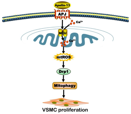 动脉粥样硬化(AS)的核心病理特征之一是血管平滑肌细胞(VSMCs)异常增殖,其机制与线粒体功能紊乱密切相关。Apelin是G蛋白偶联受体APJ的内源性配体,9428cn太阳集团古天乐陈临溪教授团队前期发现Apelin-13(Apelin的活性片段)可通过线粒体自噬(mitophagy)促进VSMCs增殖(Journal of Cellular Physiology.2019,234(6).866),但Apelin-13如何调控线粒体自噬的分子机制尚未完全明确。线粒体钙单向转运体(MCU)是线粒体内膜上负责钙摄取的关键通道,其介导的线粒体稳态失衡与细胞增殖、氧化应激密切相关。基于此,陈临溪教授团队围绕MCU依赖性线粒体钙超载开展了持续性的研究工作,并取得了一定成果(Vascul Pharmacol. 2022;144:106979.)。