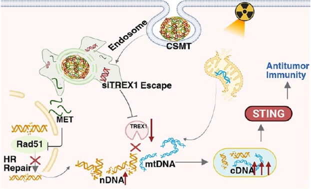 针对这一痛点,9428cn太阳集团古天乐魏华/湖南省中医药研究院喻翠云团队研发出以临床常用药二甲双胍(MET)修饰的壳聚糖(CS-MET)作为载体,以3′-5′DNA外切酶TREX1小干扰RNA(siTREX1)为治疗基因的纳米复合物的多功能纳米复合物(CS-MET/siTREX1,简称CSMT),通过放大初始DNA损伤信号来增强放疗诱导的抗肿瘤免疫并克服放疗耐受性。MET可抑制DNA修复,特异性下调同源重组修复关键蛋白RAD51,让放疗造成的DNA双链断裂难以修复,持续放大损伤信号,siTREX1沉默3'-5'DNA外切酶TREX1,减少cDNA在胞质中的清除,使其积累量提升2.7倍,充分激活cGAS-STING免疫通路,使细胞质中堆积的损伤DNA成为强烈的“危险信号”。两者协同极大强化了“cGAS-STING”免疫通路的激活,最终成功诱导了强大的抗肿瘤免疫应答和长期免疫记忆,在Hepa1-6近端/远端肿瘤模型中实现高达99.1%的原发肿瘤抑制率和显著的远端肿瘤抑制效果。该研究为克服临床放疗抵抗提供了一种极具转化潜力的新颖策略,有望改善临床治疗效果。