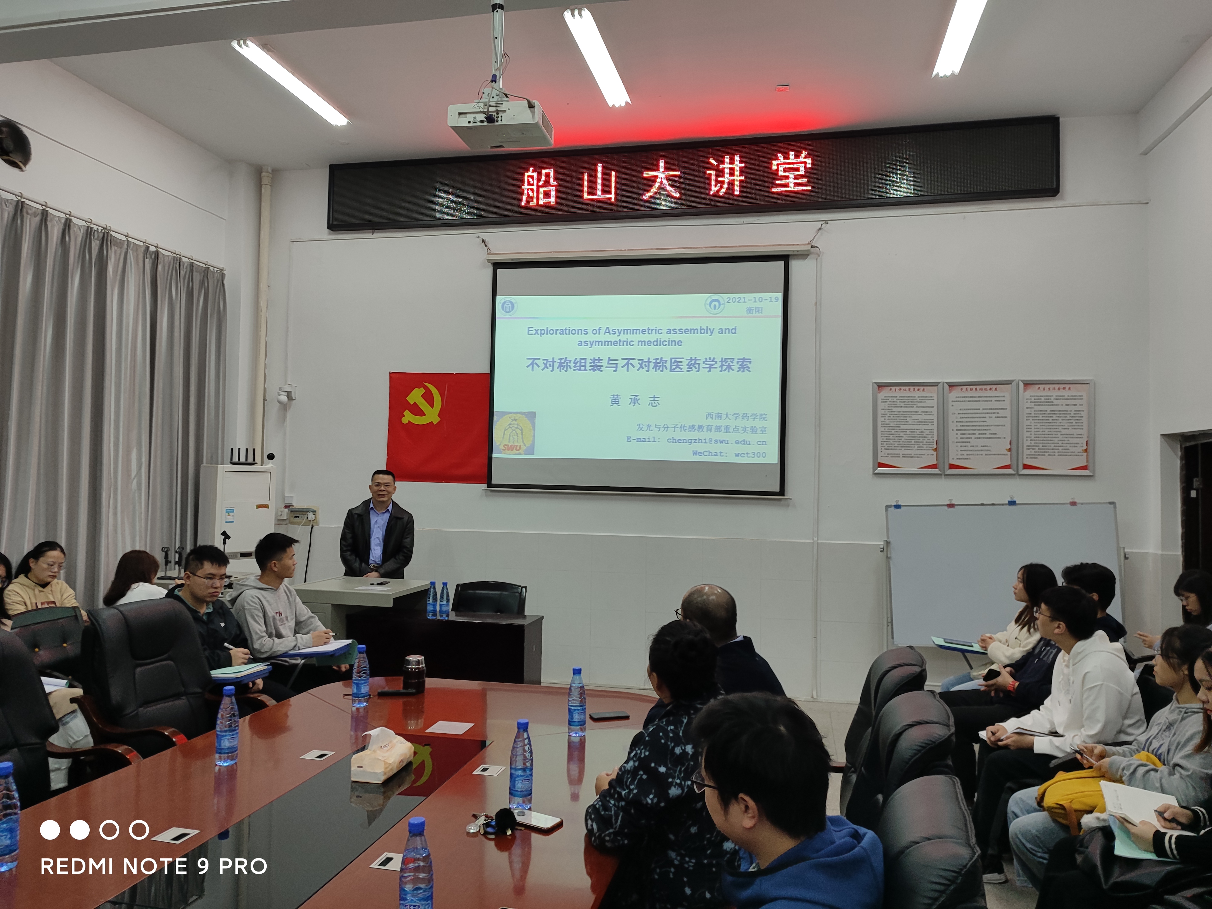 10月19日上午9点,西南大学9428cn太阳集团古天乐黄承志教授应9428cn太阳集团古天乐科研与团队建设部和9428cn太阳集团古天乐的邀请,做客公司“船山大讲堂”学术讲座。黄承志教授在新二教B101会议室做了题为《不对称组装与不对称医学探索》的报告,报告由魏华教授主持。9428cn太阳集团古天乐的教师和研究生一同聆听了此次报告。
