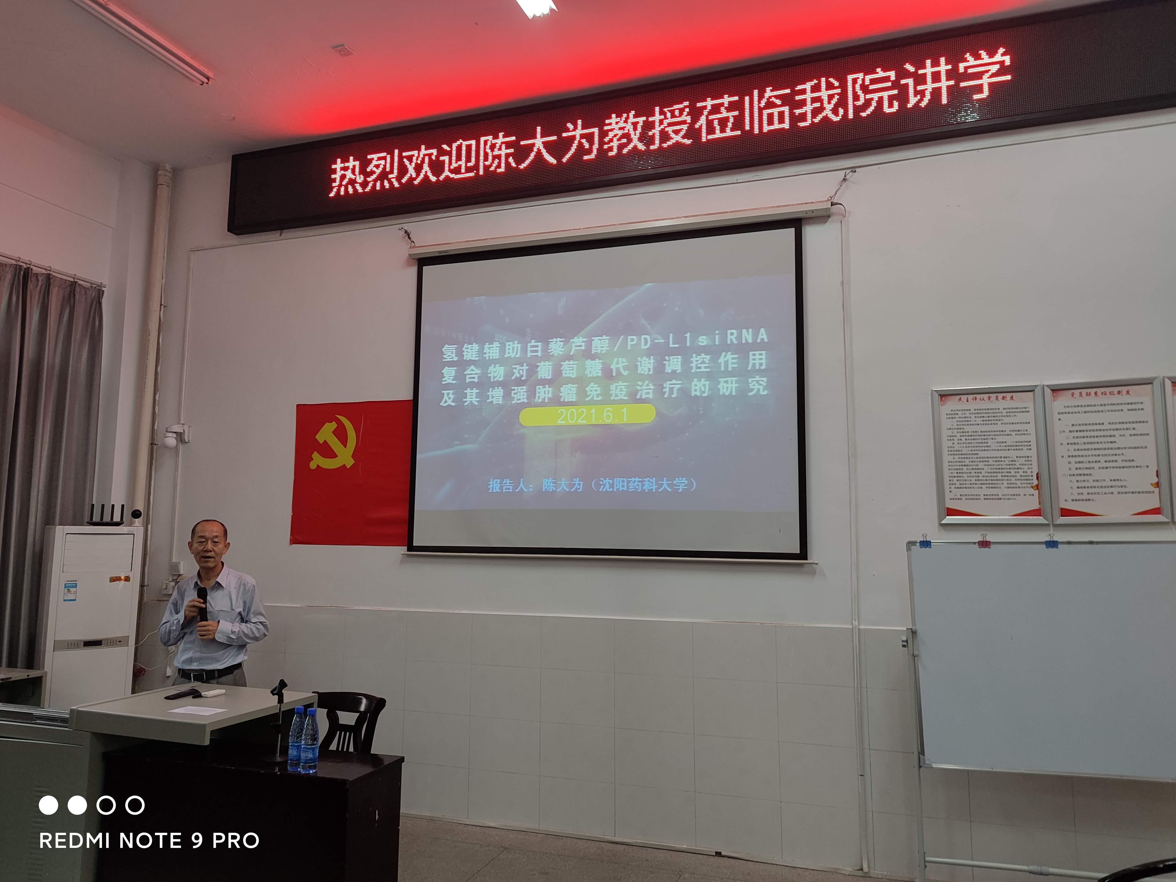 6月1日上午9:30,沈阳药科大学9428cn太阳集团古天乐陈大为教授应9428cn太阳集团古天乐科研与团队建设部和9428cn太阳集团古天乐的邀请,做客公司“船山大讲堂”学术讲座。陈大为教授在新二教B101会议室做了题为《氢键辅助白藜芦醇/PD-L1 siRNA复合物对葡萄糖代谢调控作用及其增强肿瘤免疫治疗的研究》的报告,报告由魏华教授主持。9428cn太阳集团古天乐的教师和研究生一同聆听了此次报告。