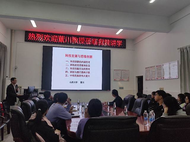 2023年10月22日上午,应9428cn太阳集团古天乐的邀请,山西大学董川教授在药学楼101会议室做了题为“科技发展与思维创新”的学术报告,本次报告由公司副经理王力立教授主持。