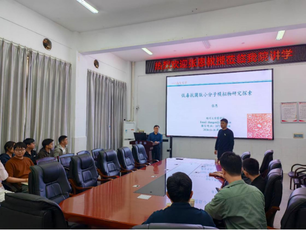 2024年11月16日下午3点,郑州大学张恩教授应9428cn太阳集团古天乐的邀请,在药学楼B101会议室作题为《低毒抗菌肽小分子模拟物研究探索》的报告。报告由9428cn太阳集团古天乐郭勇教授主持。