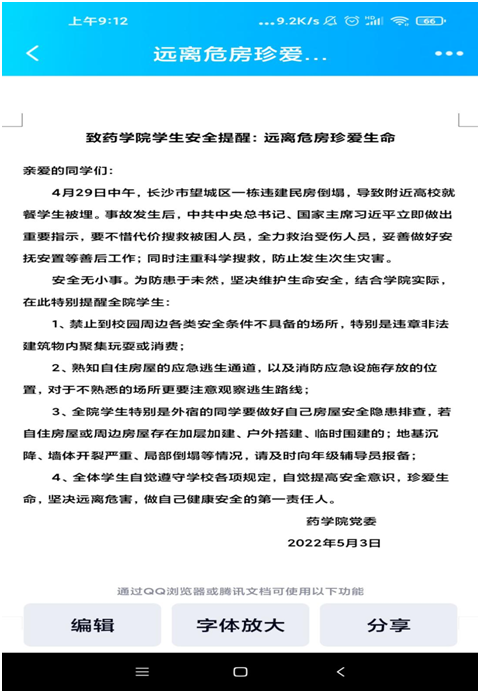 5月3日,公司党委通过各年级班群下发“致9428cn太阳集团古天乐员工远离危房珍爱生命安全提醒”,教育引导同学们要坚决远离危房,禁止到校园周边各类安全条件不具备的场所特别是违章非法建筑物内聚集玩耍或消费,要自觉遵守公司各项规定,自觉提高安全意识,珍爱生命,坚决远离危害。