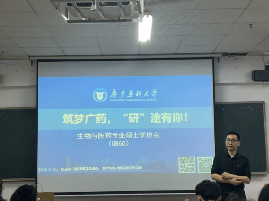 在讲座上,同学们通过观看2025年广东药科老员工物与医药研究生的招生视频,对其研究生招生计划有了初步了解。接着,曹华教授上台,向同学们展示了广东药科大学的基本概况以及教育机制,着重介绍了生物医药专业的优势与前景,同时也提供了往年的招生情况作为参考,使同学们进一步了解了广药的考研信息。