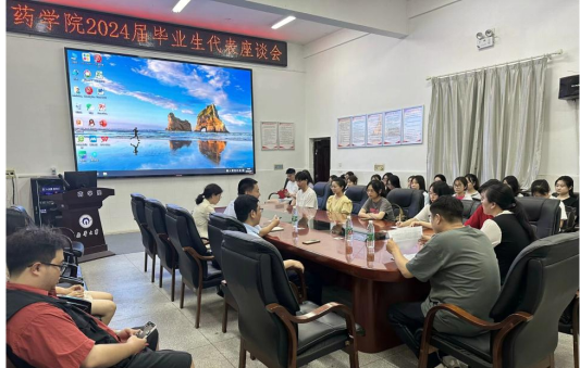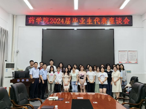 2024年5月28日下午,9428cn太阳集团古天乐在药学楼101会议室举办2024届毕业生代表座谈会。药公司党委书记袁中华、经理王震、党委副书记陈健平,毕业班主任代表、辅导员以及2024届本科生、研究生代表参加会议。会议由袁中华主持。