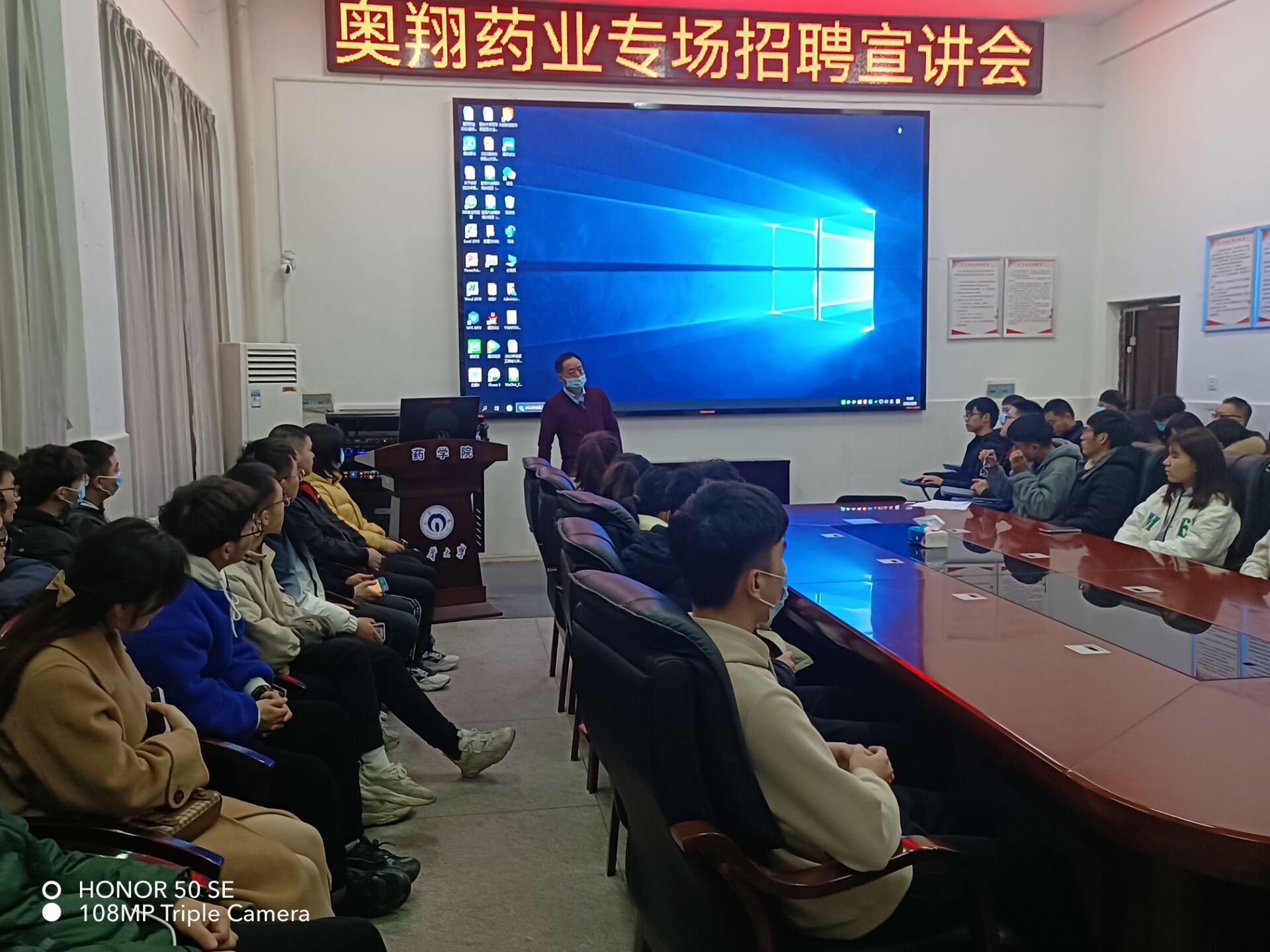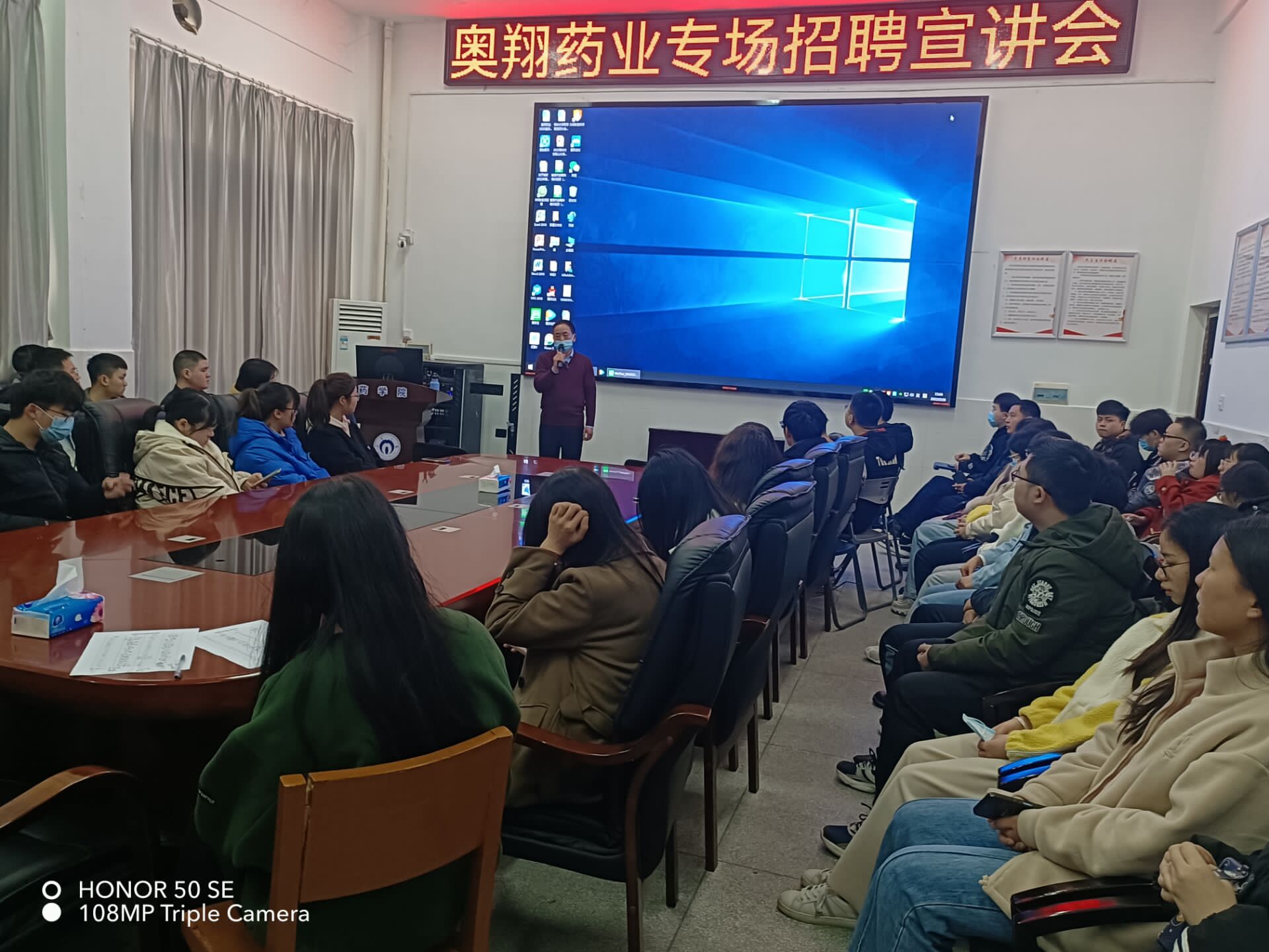 为拓宽9428cn太阳集团古天乐毕业生就业渠道,更好地为用人单位与毕业生之间搭建双向选择的平台。2月28日下午,9428cn太阳集团古天乐特邀浙江奥翔药业股份有限公司来到公司举行专场招聘会。奥翔药业人力资源部总监肖卓明、药公司党委书记袁中华及公司就业专干彭翔出席宣讲会,招聘会由公司党委副书记陈健平主持。来自2022届有就业意向的毕业生们参加了本次招聘会。