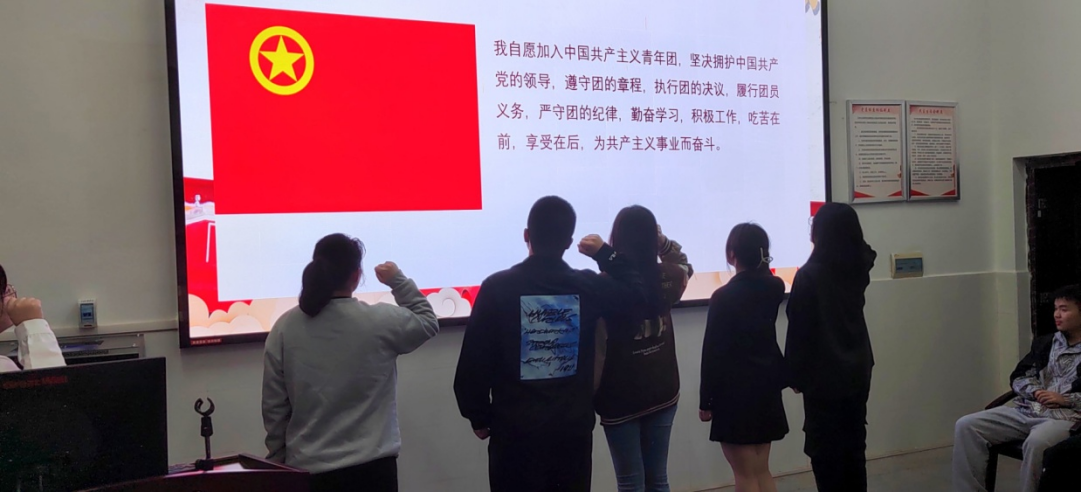 入团仪式在庄严的国歌声中正式拉开序幕。在主持人宣布新团员名单后,吕玥霖等七名新发展团员佩戴团徽,庄严宣誓。随后,主持人宣读《中国共产主义青年团章程》中有关团员的义务和权利的条款。