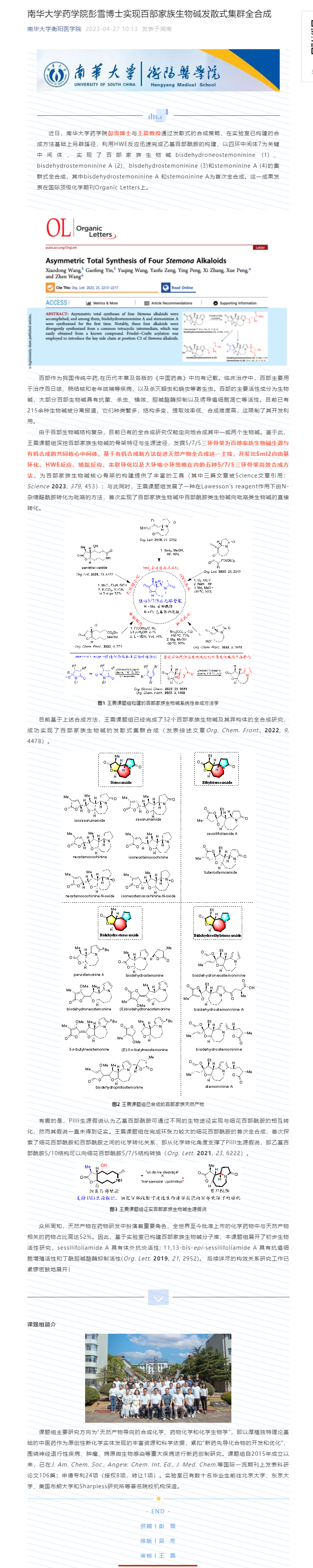 9428cn太阳集团古天乐/肿瘤微环境响应药物研究湖南省重点实验室彭雪博士与王震教授通过发散式的合成策略,在实验室已构建的合成方法基础上另辟蹊径,利用HWE反应迅速完成乙基百部酰胺的构建,以四环中间体7为关键中间体,实现了百部家族生物碱bisdehydroneostemoninine (1)、bisdehydrostemoninine A (2)、bisdehydrostemoninine (3)和stemoninine A (4)的集群式全合成,其中bisdehydrostemoninine A 和stemoninine A为首次全合成。这一成果发表在国际顶级化学期刊Organic Letters上。